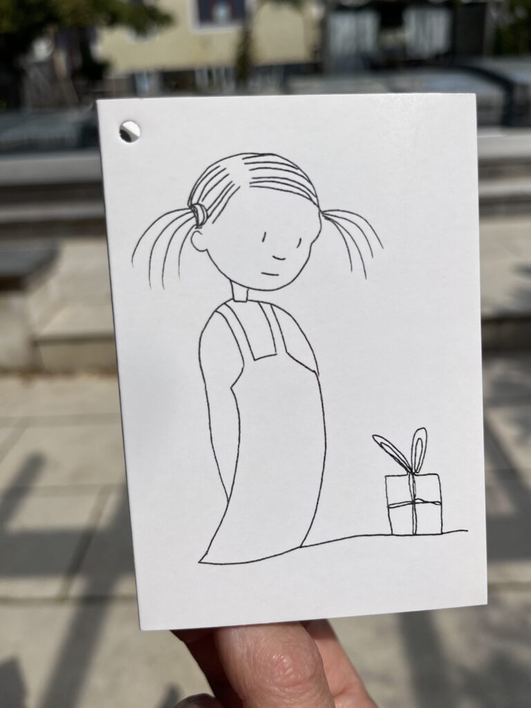Här kommer ett dubbelt kort med en enkel tusch bild på framsidan. Jag har ritat en serie med 4 olika födelsedagskort. De är perfekta till alla barn kalas som man skall gå på. De är ritade med tuschpenna och jag har försökt att göra den enkel och effektfull utan färg. Detta är ett dubbelt kort vilket betyder att du har gott om plats att skriva en födelsedags hälsning eller varför inte rita något själv på insidan!